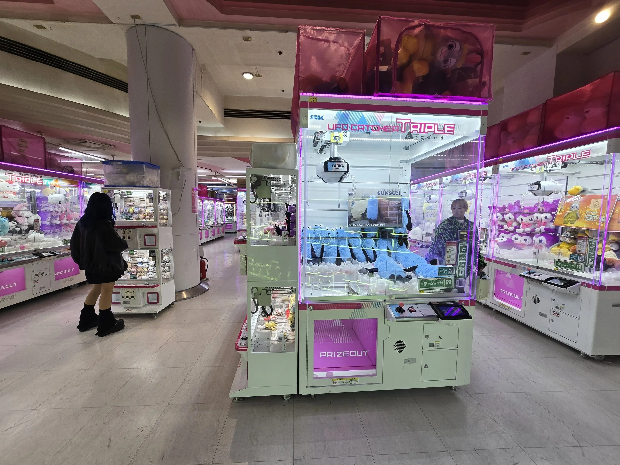 In search of reprieve, I popped into an arcade filled with claw machine games. You’ve probably seen these various places, usually filled with cheap stuffed animals or similar. But the machines here contain significantly more interesting- and random- prizes: everything from the standard stuffed toys, to manga figurines, to instant ramen cups and snacks like KitKats or Pokki. The one similarity with American machines is that these are all absolutely rigged- but at least theyre pretty cheap (usually 100 Yen, or about 75 cents). I tried my hand at a few but mostly watched others’ attempts. I had my eyes on a machine that contained gigantic Pringle cans- like 2.5 feet tall, probably. For some reason, this seemed like a good thing to go for- not considering the prospect of having to carry it around and possibly into a bar. I guess I could probably make some friends by sharing the chips.