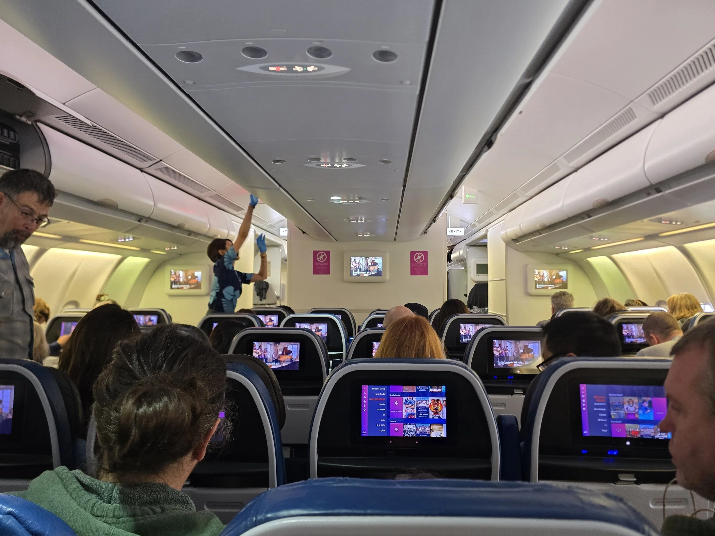 Unfortunately, no proper AC plugs- only very weak USB-A charging ports that stopped working altogether after a few hours (thank you, power bank). I spent the 90 minutes waiting for takeoff perusing some Reddit posts and blogs, adding more and more pins to my Google Maps list- so it was time well spent.